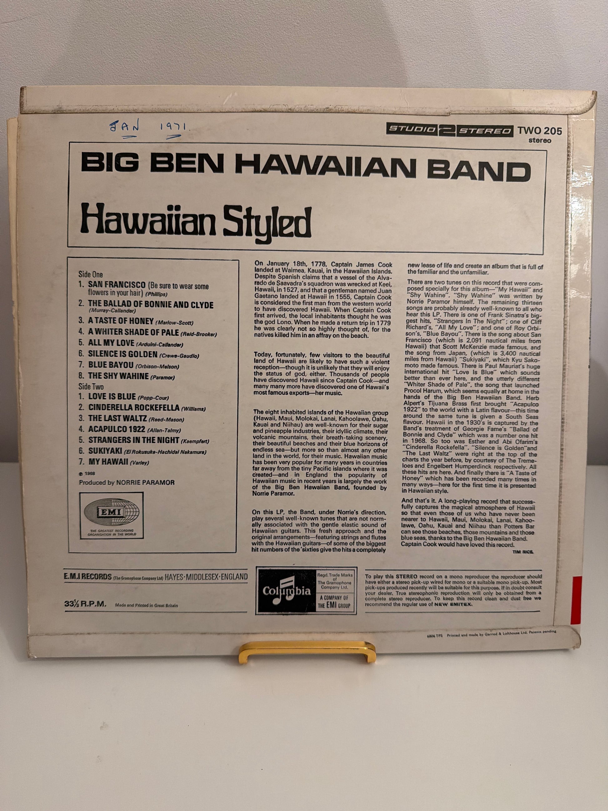 The Big Ben Hawaiian Band's "Hawaiian Styled" LP, released by Marble Arch Records in 1968, offers a unique blend of Hawaiian music infused with the popular sounds of the 1960s.