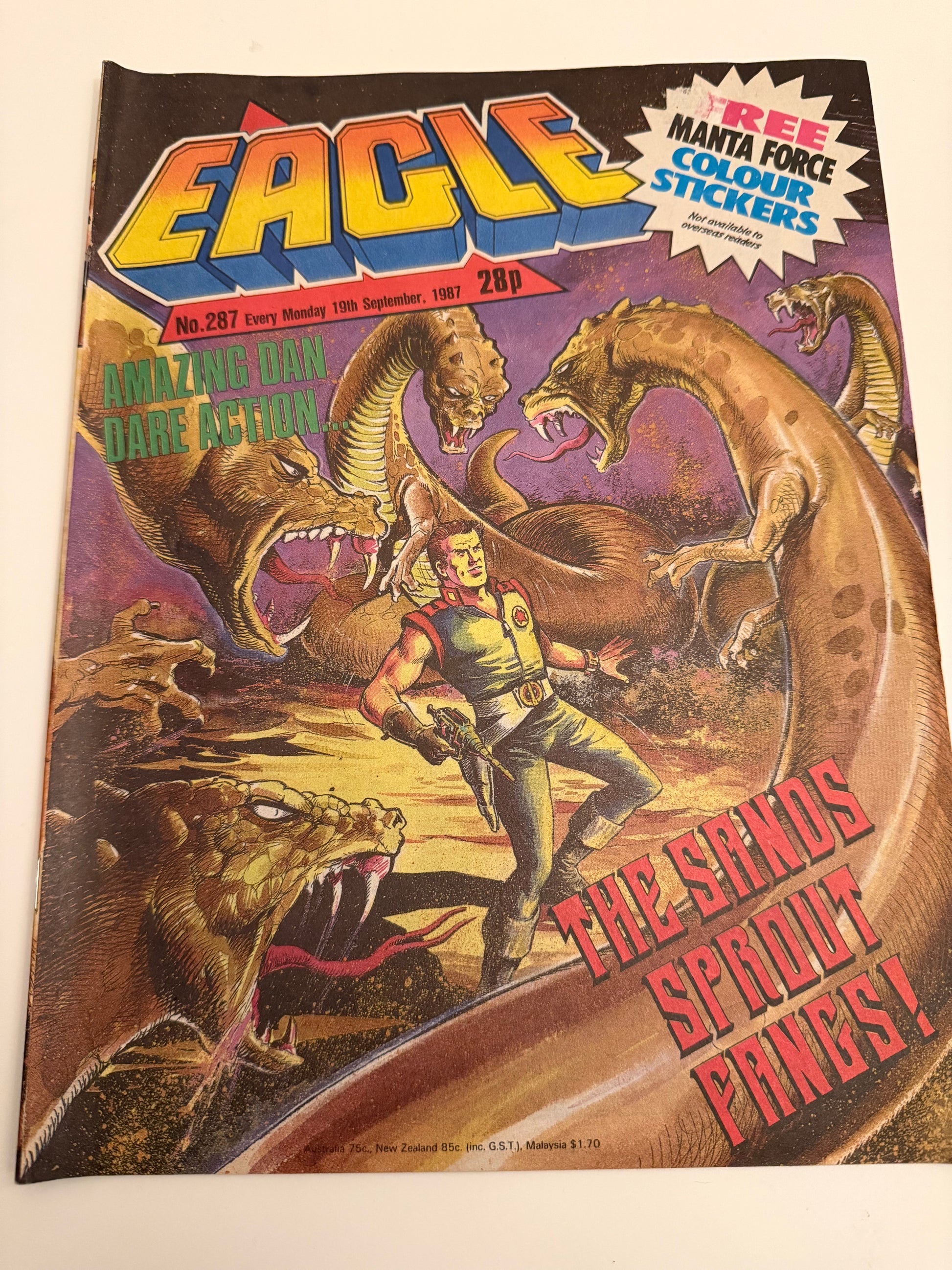• Iconic Monster Cover: A stunning piece of artwork titled "The Sands Sprout Fangs!" featuring Dan Dare surrounded by massive, multi-headed sand serpents. The purple and gold sunset palette makes this one of the most visually striking covers of the 1987 run.