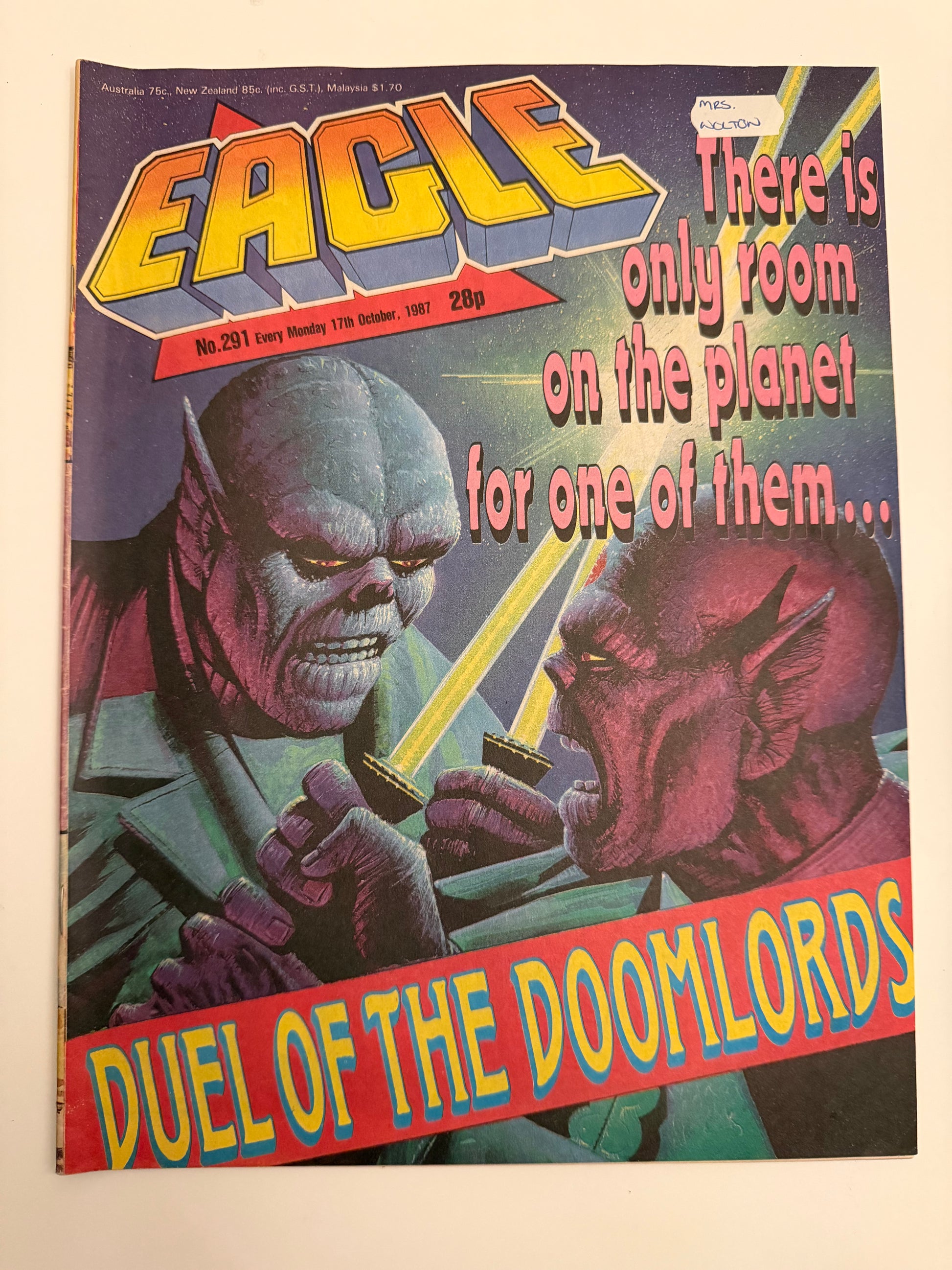 • Provenance: Features a small vintage newsagent mark in the top margin ("Mrs Wolton") on a white sticker—a common and authentic trait for comics from this period.