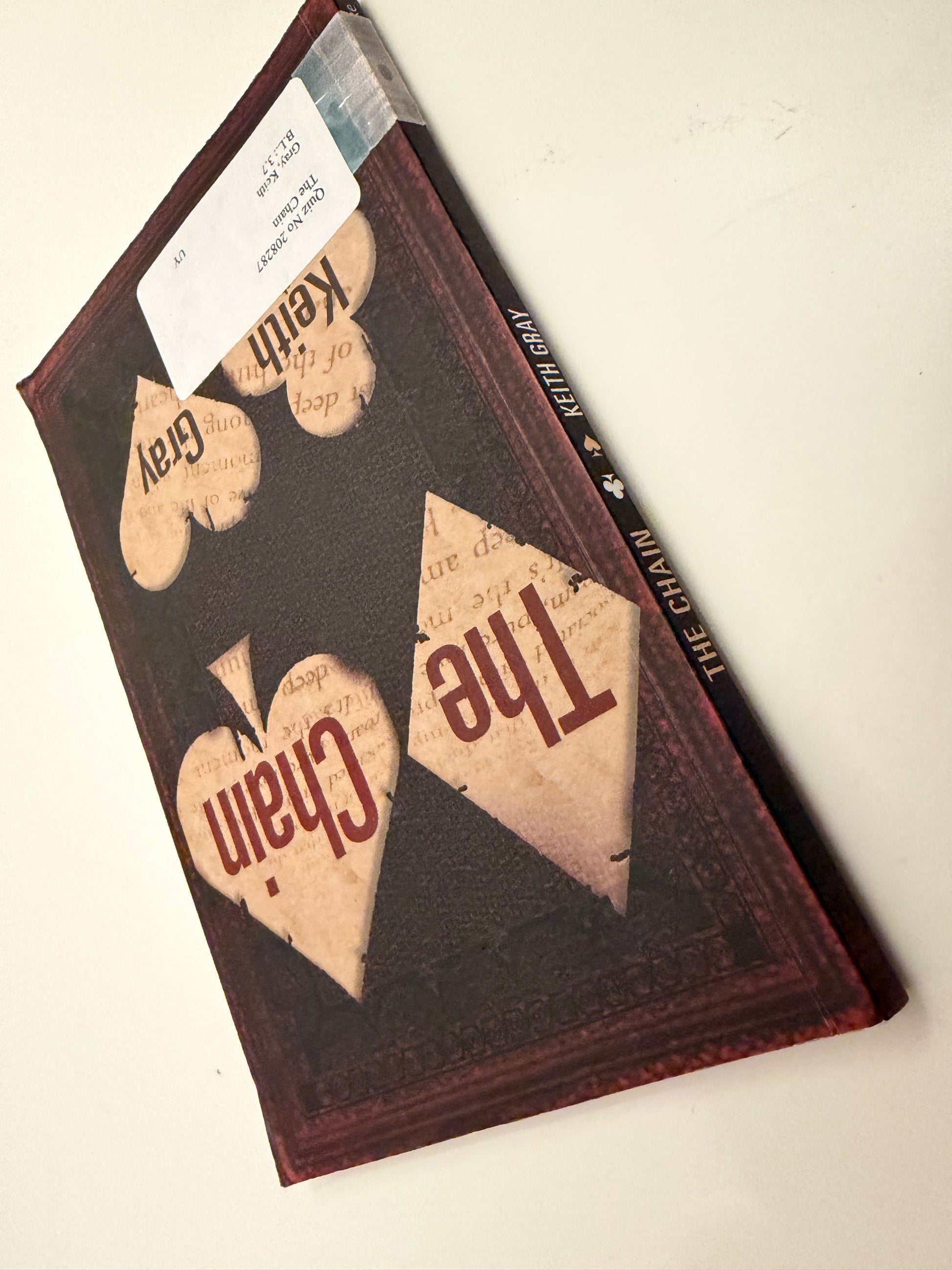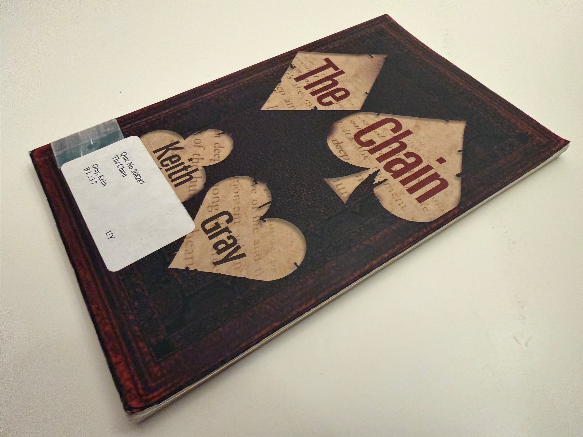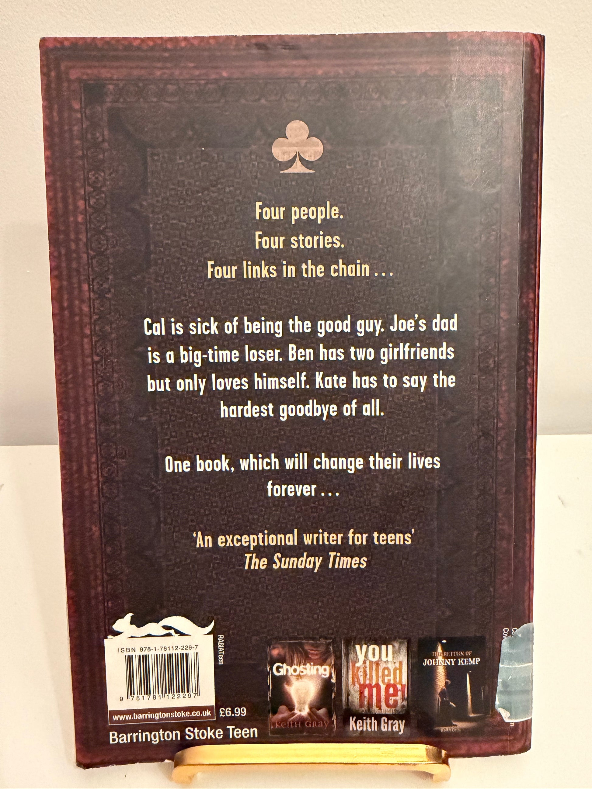 This is "The Chain" by Keith Gray, another entry in the collection of "Hi-Lo" (High Interest, Low Literacy) books. Keith Gray is a highly acclaimed author in the UK, known for writing realistic, gritty stories that resonate with teenagers.